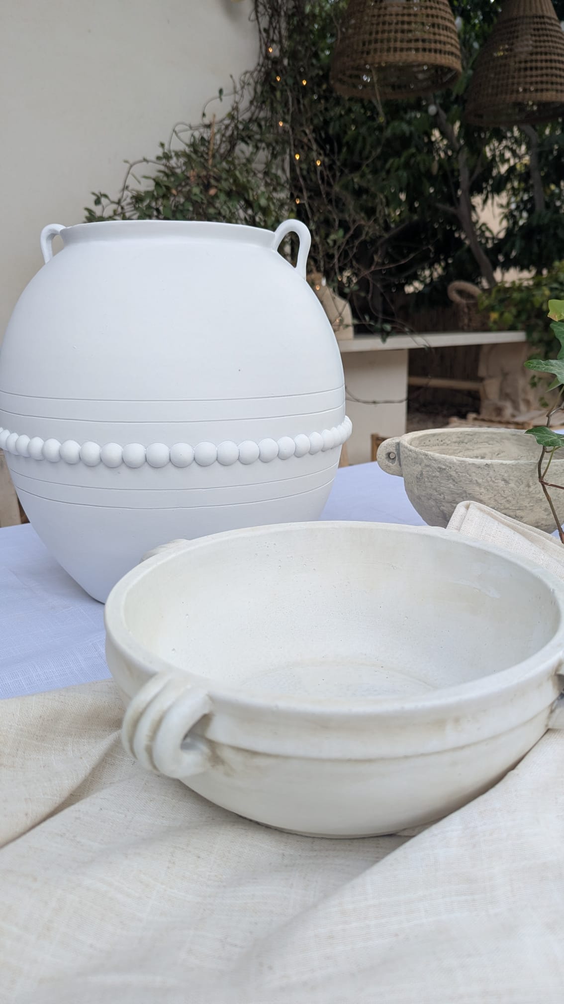 כד גדול בגוון לבן מט עם עיטור חרוזים בסגנון יווני קלאסי.